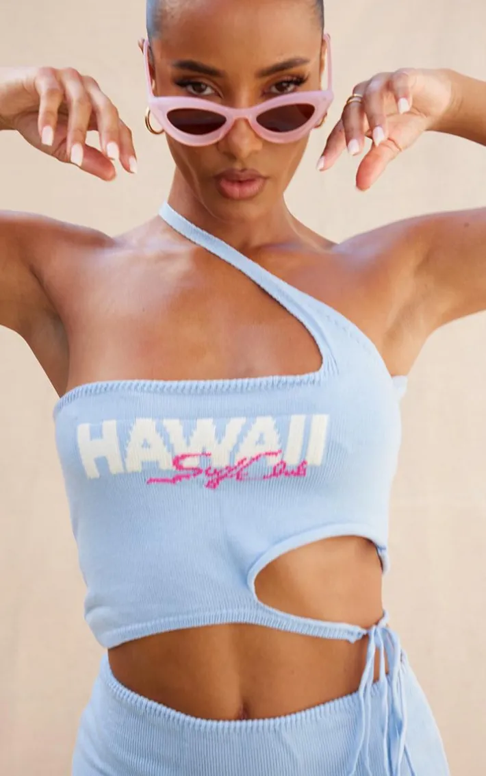 Take your everyday look to the next level with this baby blue Hawaii soft knit cut out top perfect for your everyday styling and beyond. This top is brought to you in a baby blue soft knit material with an ‘Hawaii’ print and a cut-out design, we simply can’tget enough. With It’s versatile style this top is sure to be your new go-to. Style with slides, the matching skirt and accessories for a look that we can’tget enough of.