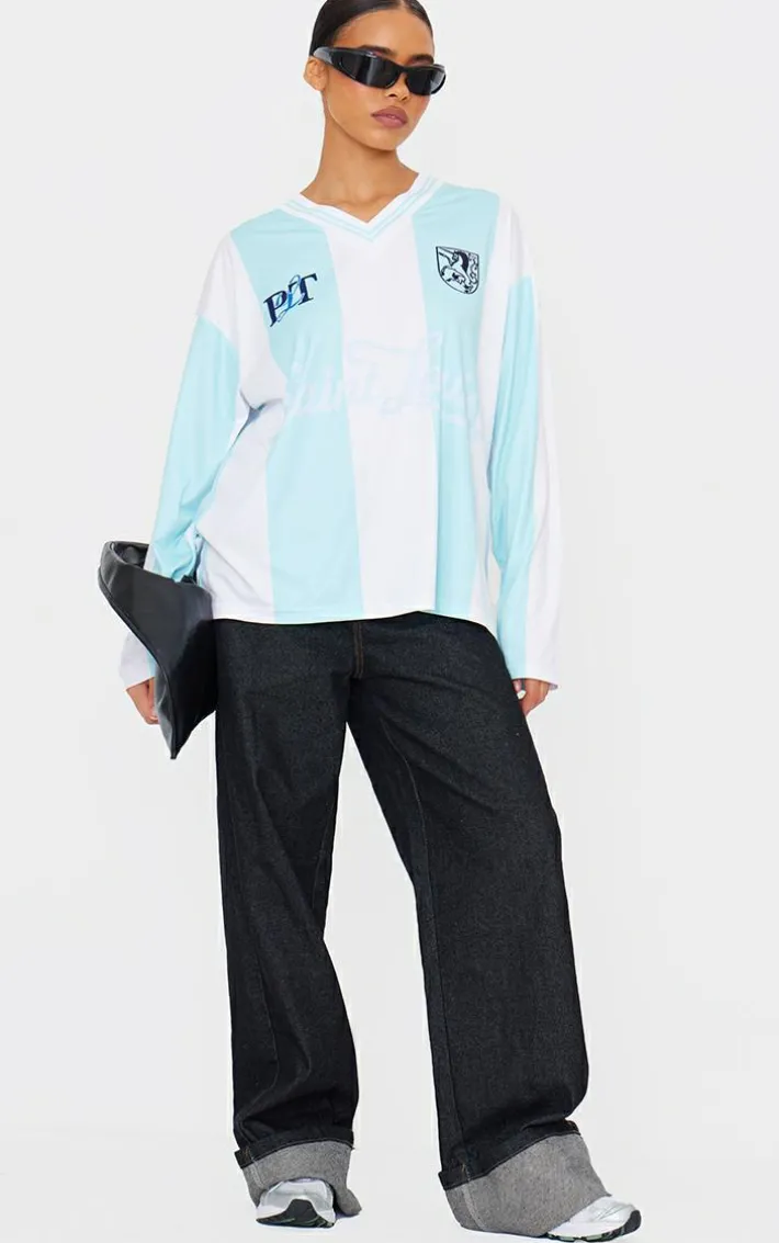 You’re going to look effortlessly cool in this baby blue logo sports striped long sleeve jersey. Add a pop of color to your wardrobe with this unreal blue shade, paired with a sporty logo detail and striped design, we can’t get enough. Style this with some black capri pants and ballet flats to stay at the top of your style game.
