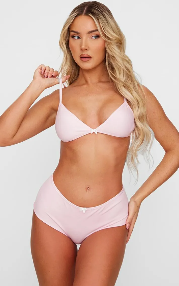 This baby pink bow detail triangle bra is a must-have in your staples collection. With the ultimate baby pink color and bow detail combo, you’ll look and feel your best. Simply pair this baby pink bra with the matching panties and style under your outfit of the day for a look we just can’t get enough of.