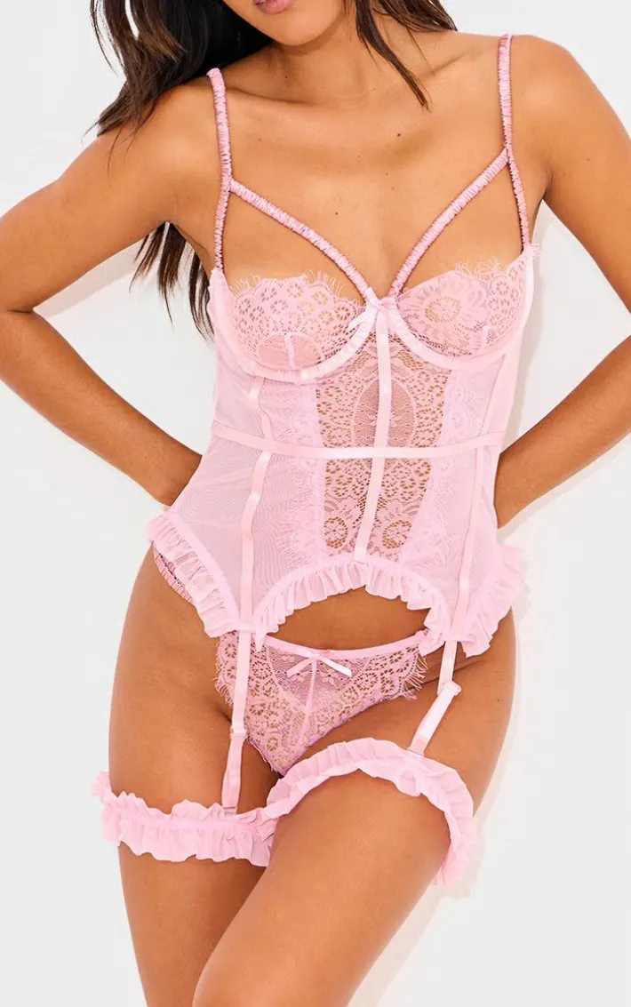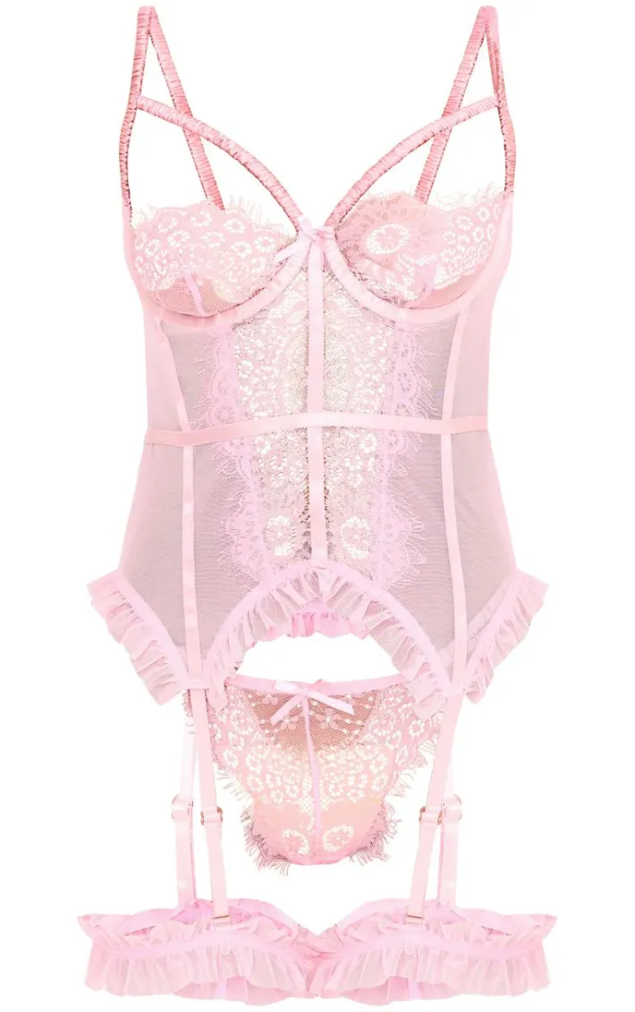 Get hearts racing this season with this lingerie set. Featuring a longline corset, thongs and a matching garters all in a baby pink eyelash lace material, we are obsessed. Simply complete this set with stockings for a look were are obsessed with.