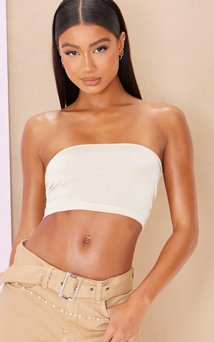 This top is perfect for your everyday wardrobe. Featuring a cream slinky material with a bandeau design, what’s not to love? For a weekend-worthy fit, wear with a mini skirt, heels and a mini bag.