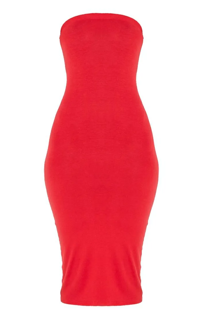 This simple sleek midaxi dress is perfect for sculpting your shape. Featuring a basic red jersey material and an elasticated bandeau neckline, team it with some red strappy heels to finish off the look.
