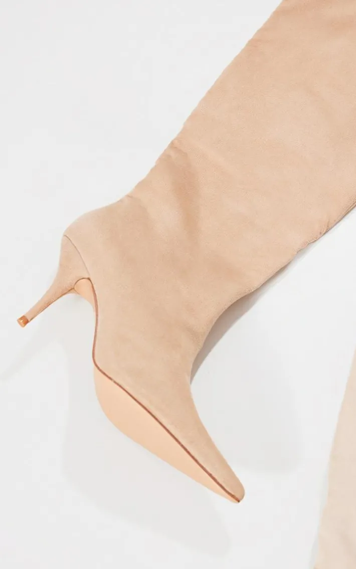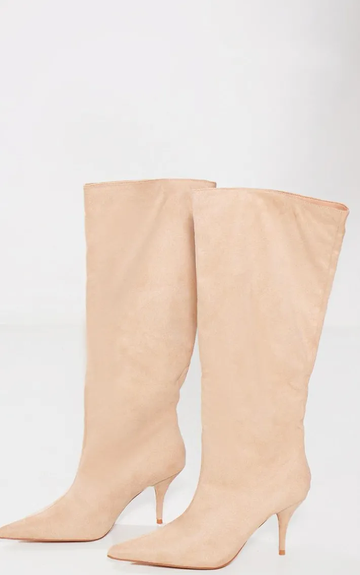 Channel all the chic vibes into your new season wardrobe with these beige faux suede point toe low heeled knee high boots, they’re a definite yes from us. With a beige hue faux suede material with a pointed toe design and a low heel, everyone will be asking about these boots. Pair them with your fave weekend fit for a next level look.