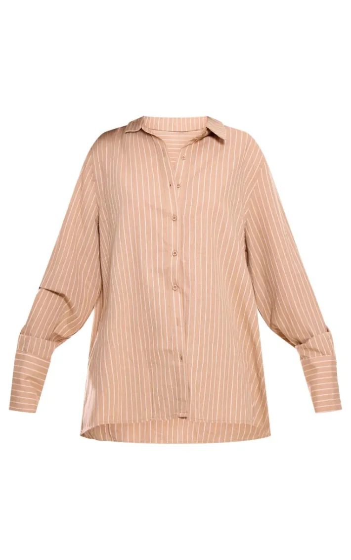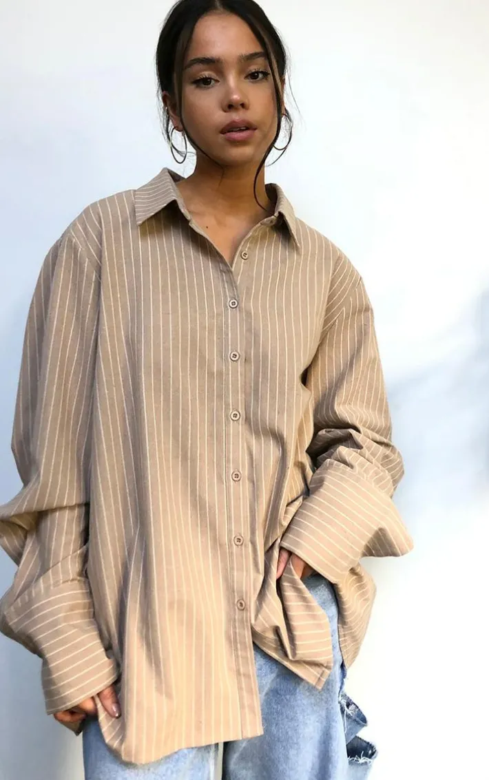 This beige oversized pinstripe cuff shirt is at the top of our new season hit-list. Made from a beige material with pinstripe detail, long sleeves, a button front fastening and an oversized fit, what more could you want? Wear this beige shirt with a mini skirt and sneakers for a look that’s on trend this season.