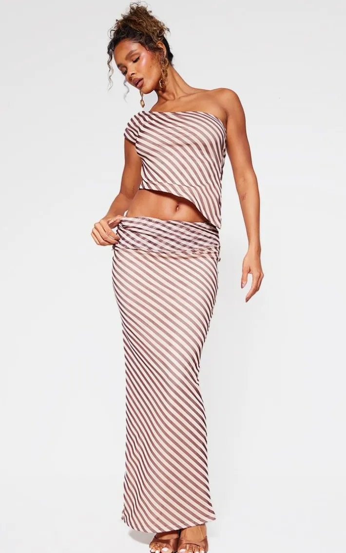 Look all kinds of glam in this beige pinstripe chiffon ruched asymmetric long top. Brought to you in a beige hue pinstripe chiffon material with a ruched detail and asymmetric design, this long top is calling your name. Style with the matching skirt, clear heels and gold accessories to turn heads for all the right reasons.