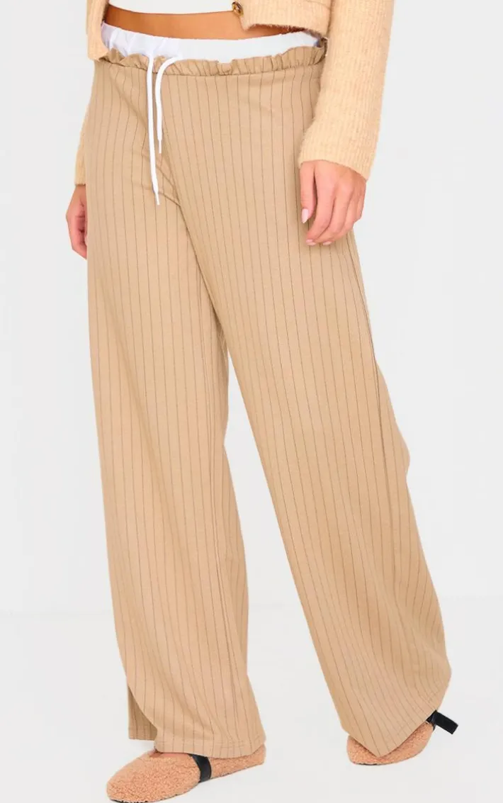 These beige pinstripe contrast waistband wide leg pants are sure to be a staple in your new season wardrobe. Brought to you in a beige hue pinstripe material with a contrasting waistband and a wide leg fit, how can you resist? Style these beige pants with a cardigan, sneakers and a neutral hue cap for a simple yet chic everyday look we’re loving.