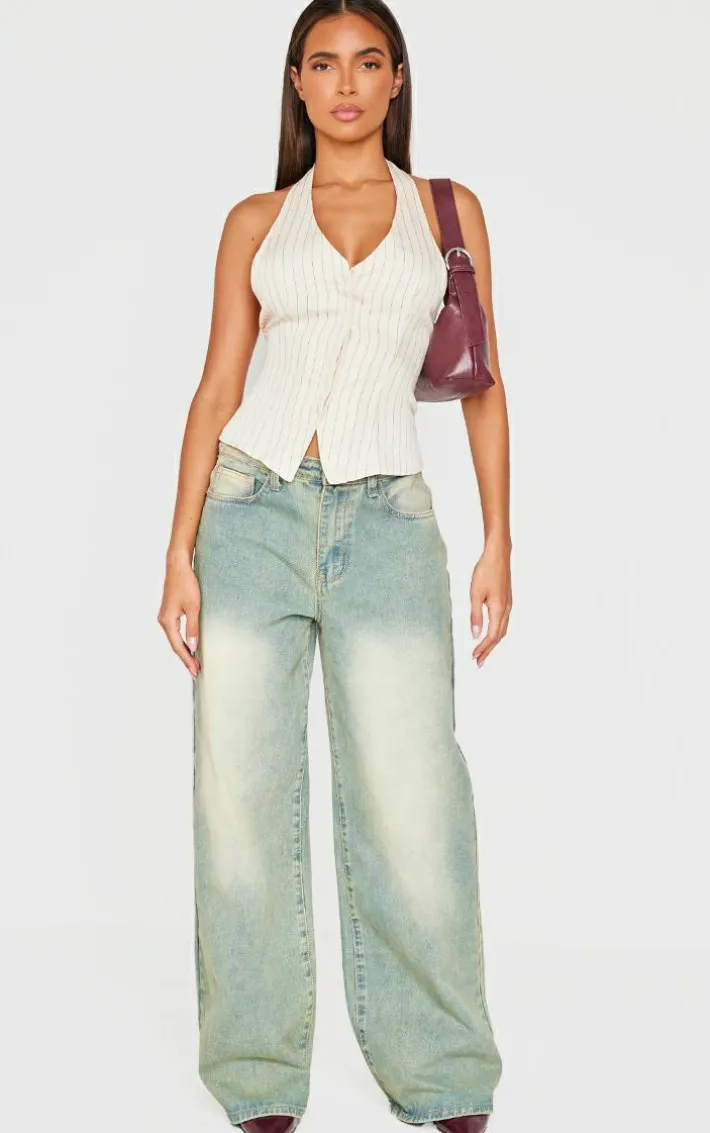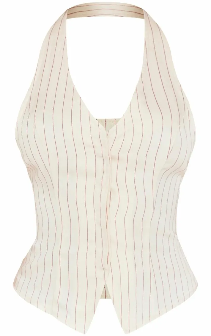 Elevate your day to day style with this beige pinstripe halterneck vest. Brought to you in a versatile beige hue, with a must have pinstripe design and halterneck cut, this top is sure to give a figure-flattering finish. Style with a pair of jeans and a statement shoulder bag to really finish off the look.