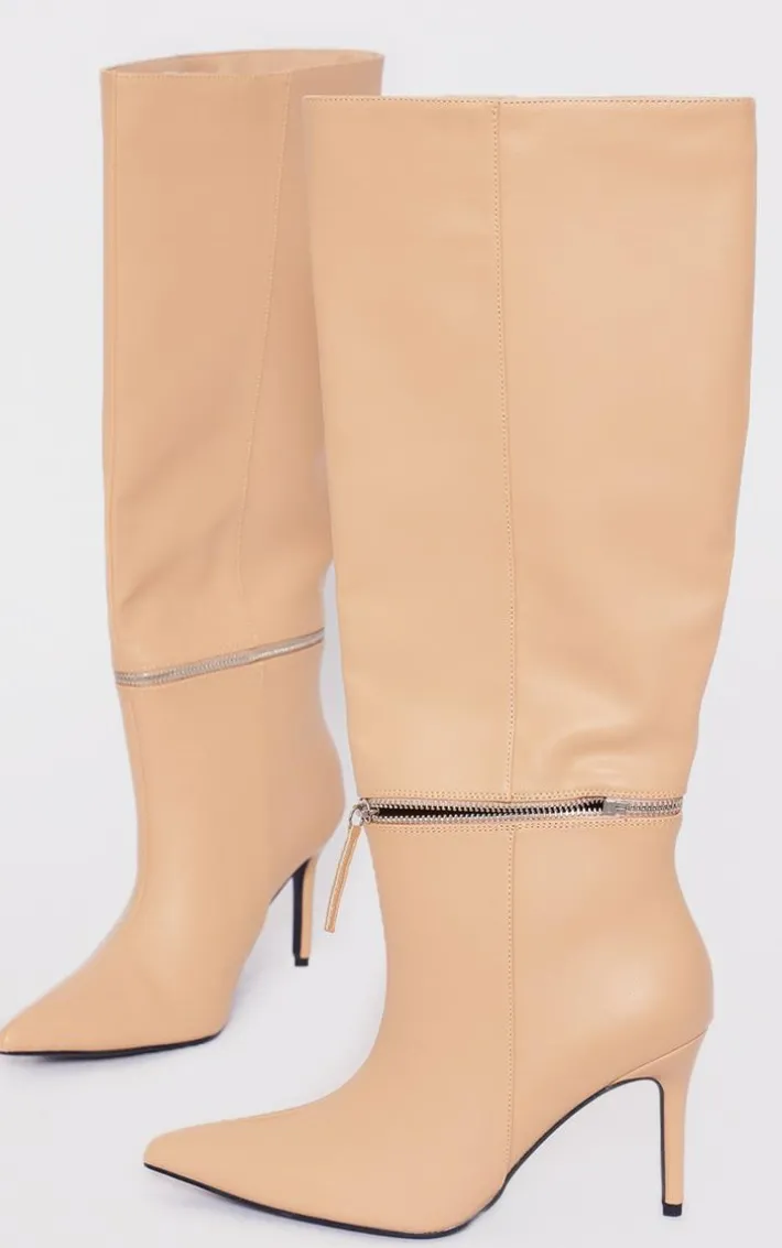 Add some neutral tones to your shoe-drobe collection with these beige PU point toe zip off knee high stiletto boots. These boots are brought to you in a beige PU material with a pointed toe, a zip-up design and a knee-high style, what’s not to love? Pair these with your outfit of the day for a look like no other.