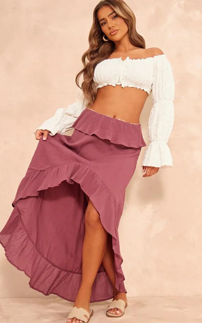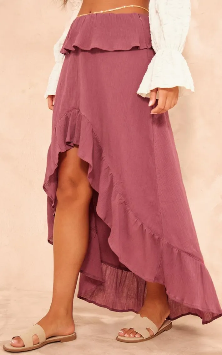 Switch up your new season style game with this berry cheesecloth shirred waist waterfall hem maxi skirt, we’re in love. This skirt features a berry hue cheesecloth material with a shirred waist design and a waterfall hem, you won’t be able to resist. Pair with a long sleeve top, sandals and your fave accessories for a glam finish.