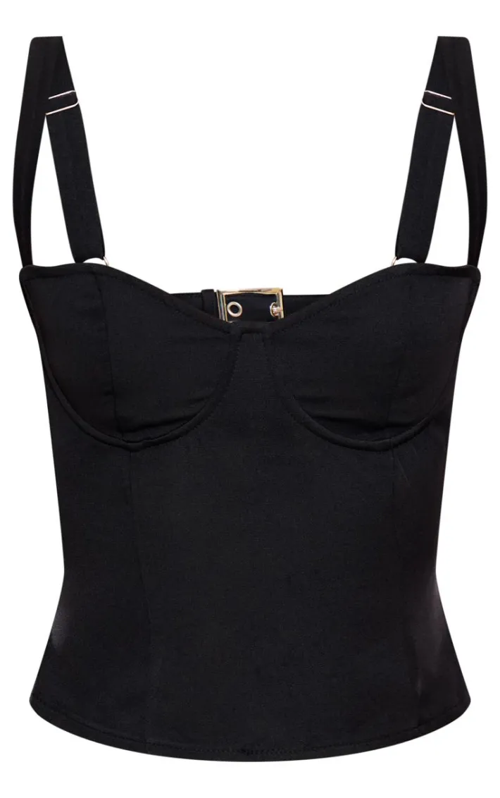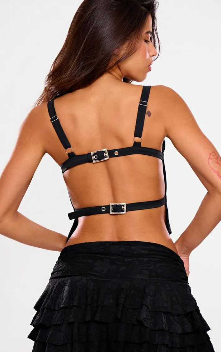 This black backless buckle detail crop top is fierce addition to any weekend wardrobe. Brought to you in a versatile black shade, with a backless design and buckle detail, you’ll look effortlessly chic whatever the occasion. Style with a black ruffle skirt and heels for a look that won’t go unnoticed.