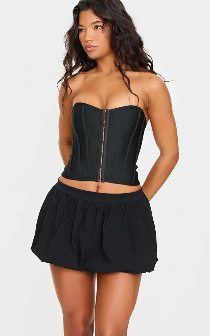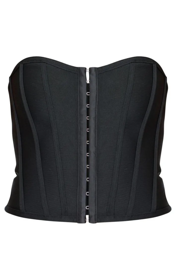 Cinch in your waist with this fierce corset. Featuring a black bandage material with hook and eye fastenings and a structured design. Team this with your fave jeans and strappy heels to complete the look.