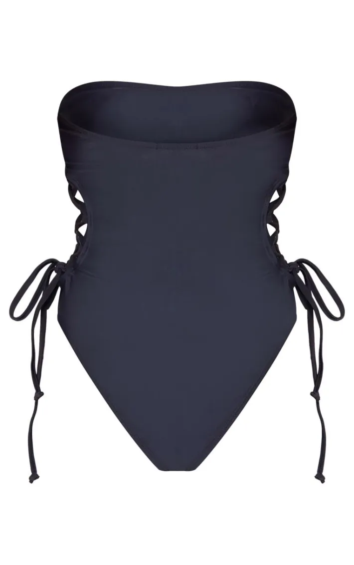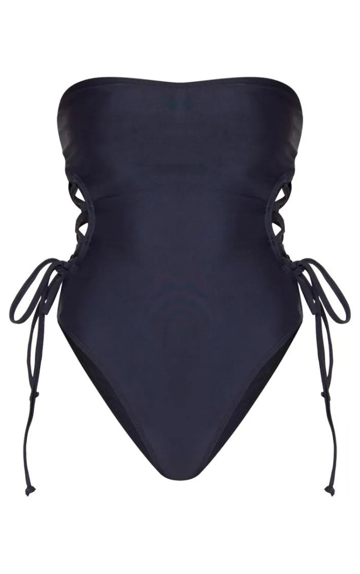 Make holiday styling look effortlessly chic with this black bandeau tie side swimsuit. Brought to you in a black hue material with a bandeau neckline and tie side detailing, how can you resist? Style this black swimsuit with gold accessories to take your poolside look that extra mile.