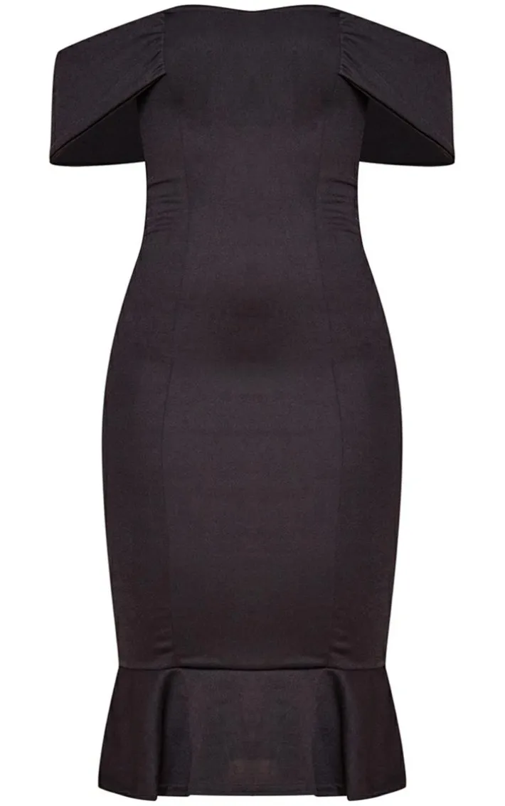 Get black tie occasion ready with this bardot midi dress. Are you ready to turn heads for all the right reasons? Then look no further than this bodycon dress featuring a flattering bardot neckline and frill hem, we are seriously obsessed. Made in a perfect midi style this bardot dress is perfect for those special occasions and beyond. Just add some neutral strappy heels and statement accessories to give your look the finish it deserves.