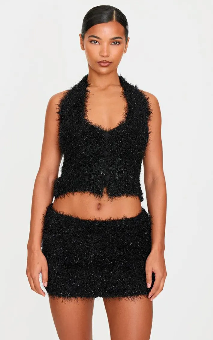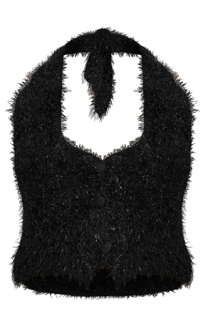 Bring all the edge to your outfit of the day with this black bobble eyelash knit halterneck vest. Brought to you in a black bobble knit material with an eyelash design and a halterneck fit, we are obsessed. This vest is the perfect addition to your new season wardrobe. Team with a pair of wide leg pants and gold accessories to finish off the look we are loving.