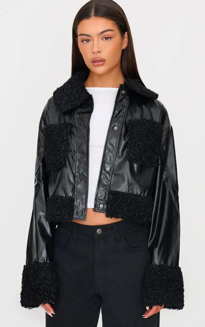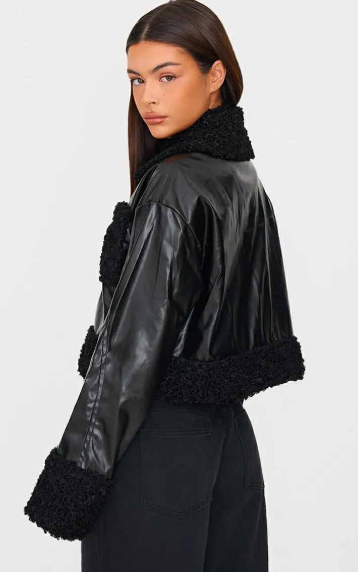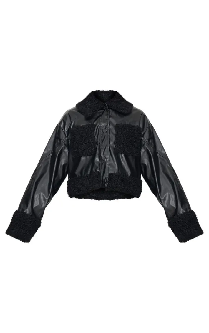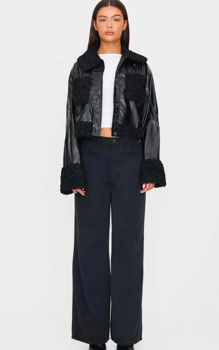 Upgrade your outerwear collection this season with this black borg pocket front faux leather cropped coat. Made from a black faux leather material with borg detailing and a cropped length, how could you resist? Perfect for letting you work your unreal styling techniques, this coat is at the top of out wishlist. For a look we’re loving, team with a basic crop tee, denim jeans and court heels.