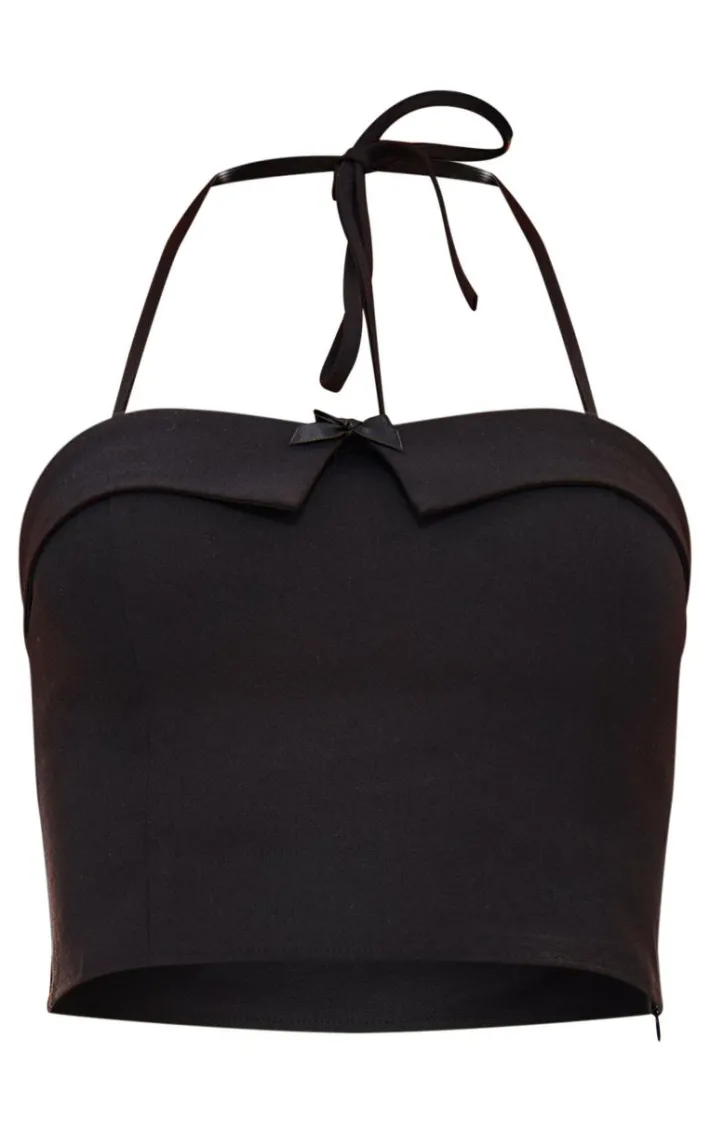 Look all kinds of chic in this black bow detail tie neck halterneck crop top. Brought to you in a black hue material with a halterneck design, bow detailing and a cropped fit, what more could you need? Pair this crop top with the matching skirt, block heels and gold accessories for a look that is sure to make you stand out from the rest.