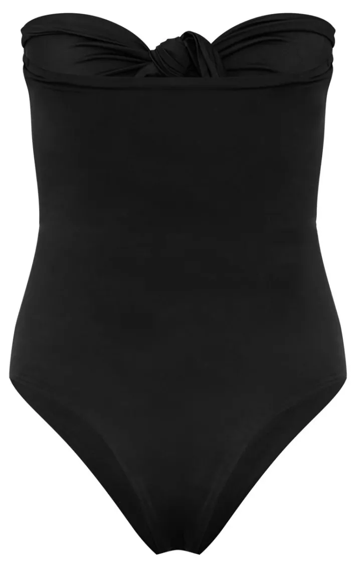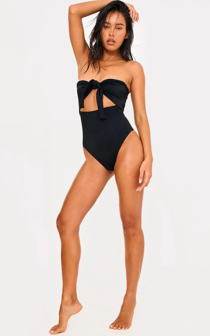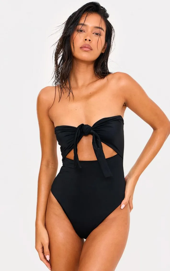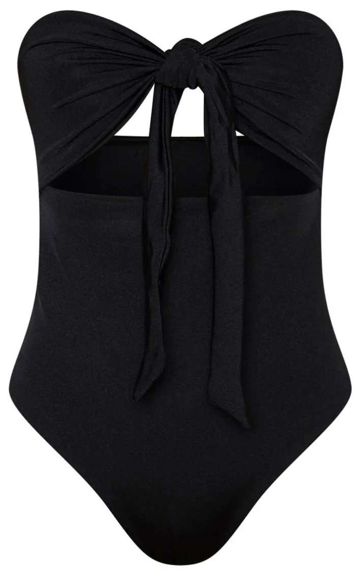 Every vacay wardrobe needs a must-have black swimsuit. Featuring a black hue material with a cut-out bow front and a bandeau neckline, style it with a maxi beach skirt and wedges to complete the look.