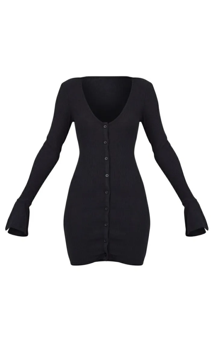 This versatile dress is perfect for any occasion. Featuring a black brushed rib material with a plunging neckline, flared sleeves and a flattering fit. Team this with knee high boots and gold accessories to complete the look.