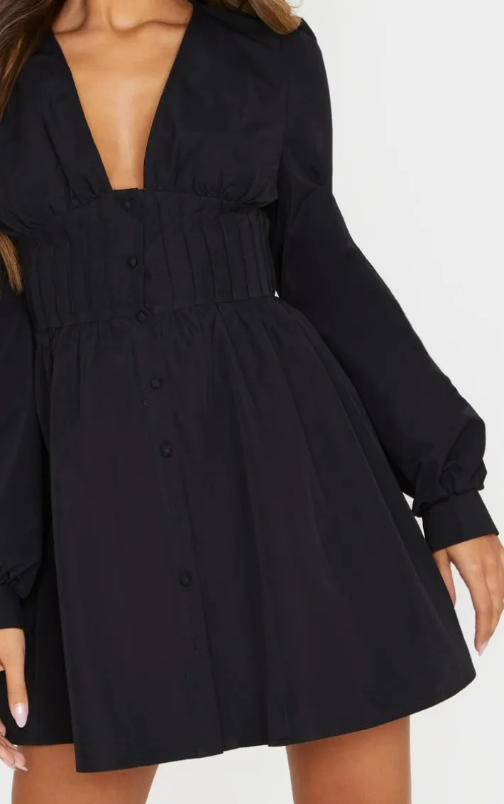 Hit refresh on your weekend wardrobe with this skater dress. Featuring a black woven fabric with a button front and puff sleeves, style with sock boots for an all-black look we’re loving.