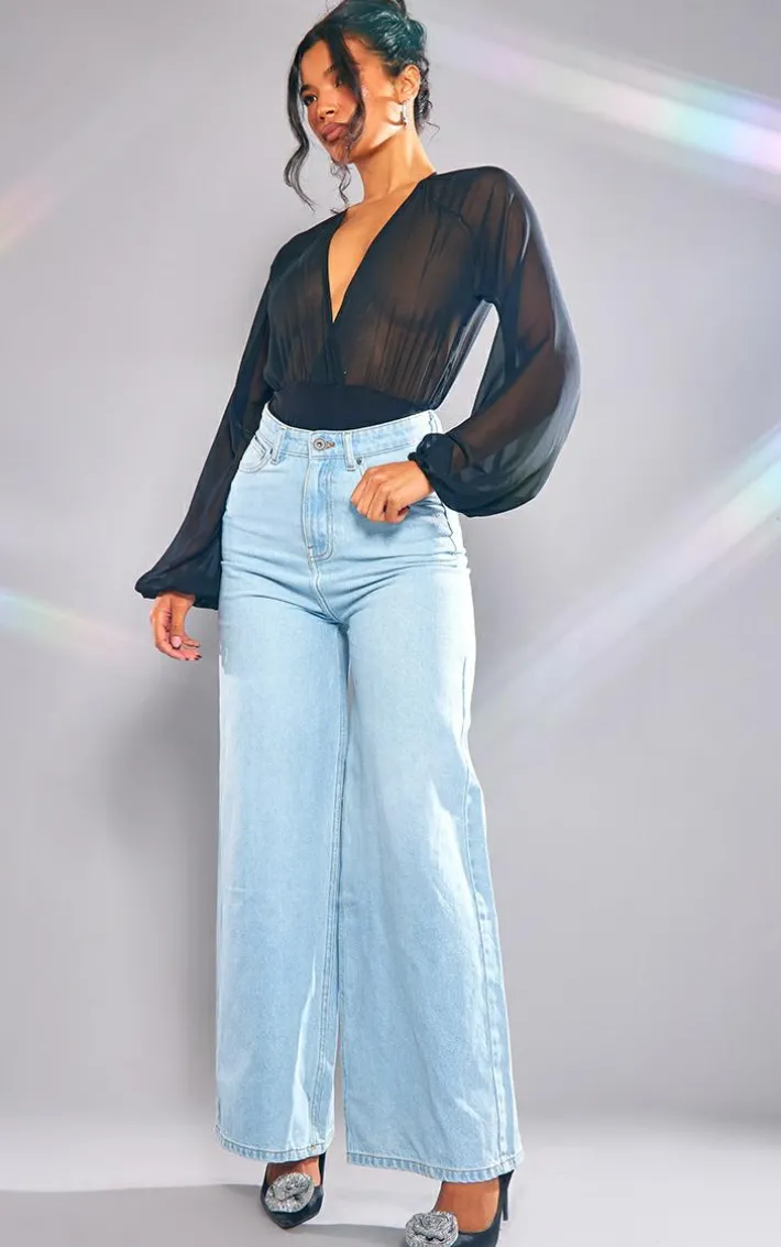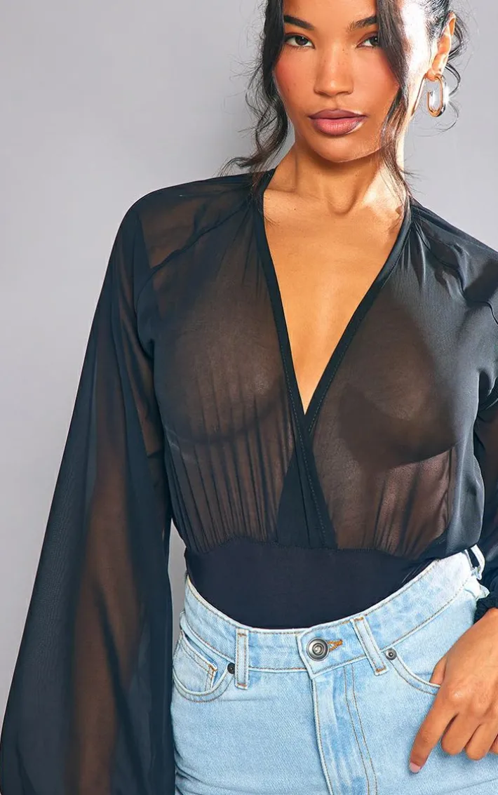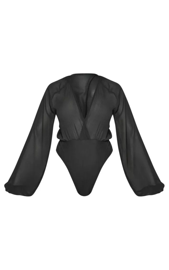 Your weekend styling dilemmas are finally sorted with this black chiffon balloon sleeve plunge bodysuit, everyone will be asking about this statement piece. It features a black chiffon material with balloon sleeves and a plunge neck design, get ready to channel all the glam vibes. Team this chiffon bodysuit with a mini skirt, slip-on heels and a shoulder bag to elevate the look further.