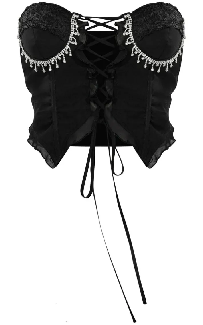 Say goodbye to those last-minute ‘fit emergencies with this black chiffon boned diamante trim lace-up bandeau crop top. Made from a black chiffon material with diamante trim detailing, a lace-up design and a figure-flattering fit, how could you say no? Perfect for those weekend plans , this crop top will always nail the dress code. Simply add denim jeans, clear heels and your fave accessories for a weekend-worthy finish.