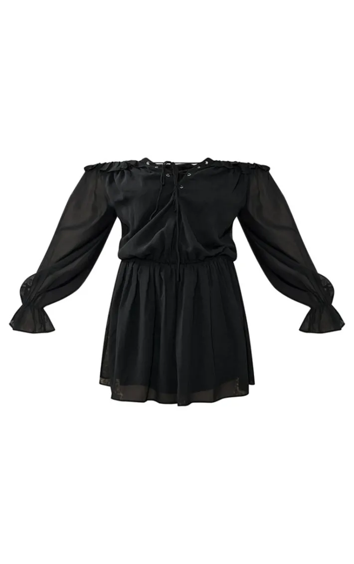This black chiffon frill bardot shift dress is all you need to feel effortlessly chic this season. Brought to you in a black chiffon material with a frill detail and a bardot fit, we can’t get enough. This shift dress is sure to make you center of attention. Style with a pair of your fave cowboy boots and your go-to cowboy hat to complete the look we are loving.