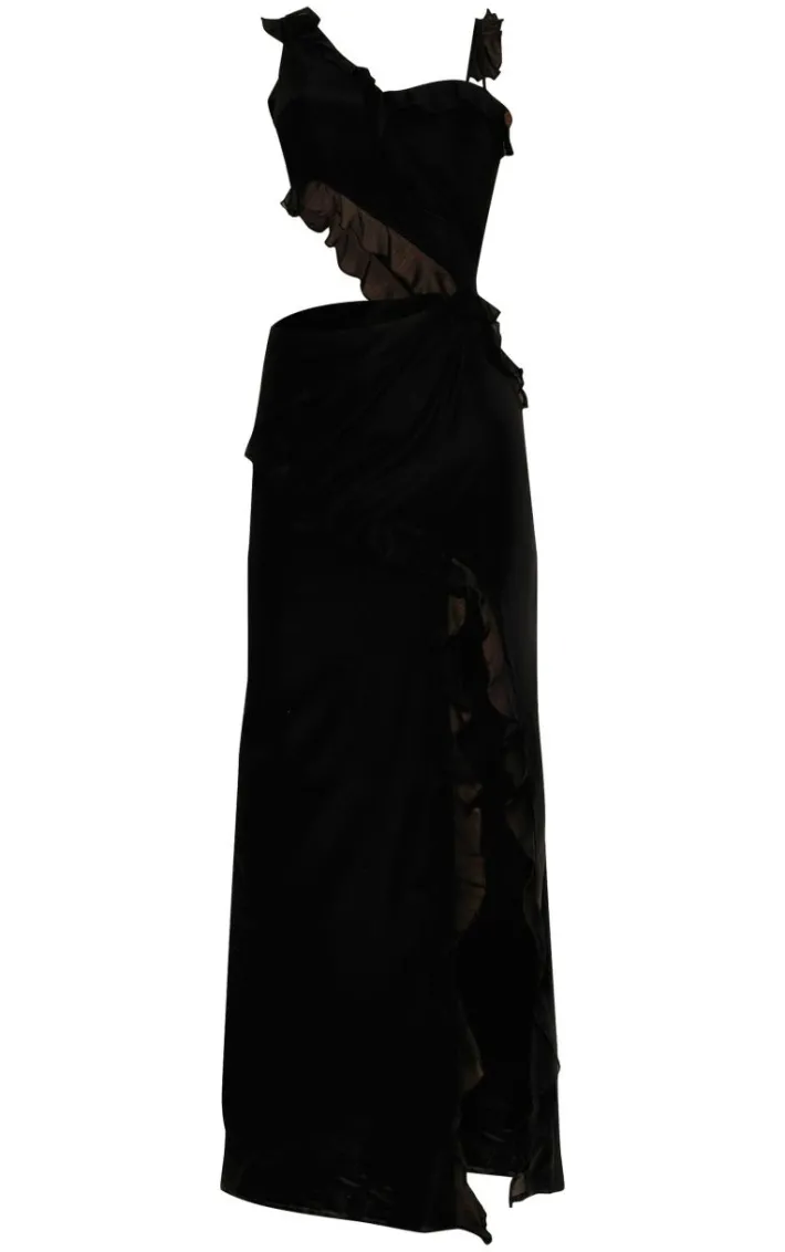 We’re totally in love with this black chiffon frill cut out maxi dress for your weekend plans. It is made from a black chiffon material with frill detailing, a cut-out design and a maxi length, how could you not be obsessed? This maxi dress gives you endless styling potential and is bound to give your look that extra chic touch. Style seamlessly with the clear heels and gold accessories for a seriously luxe finish.
