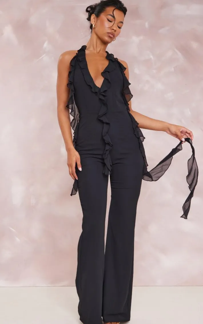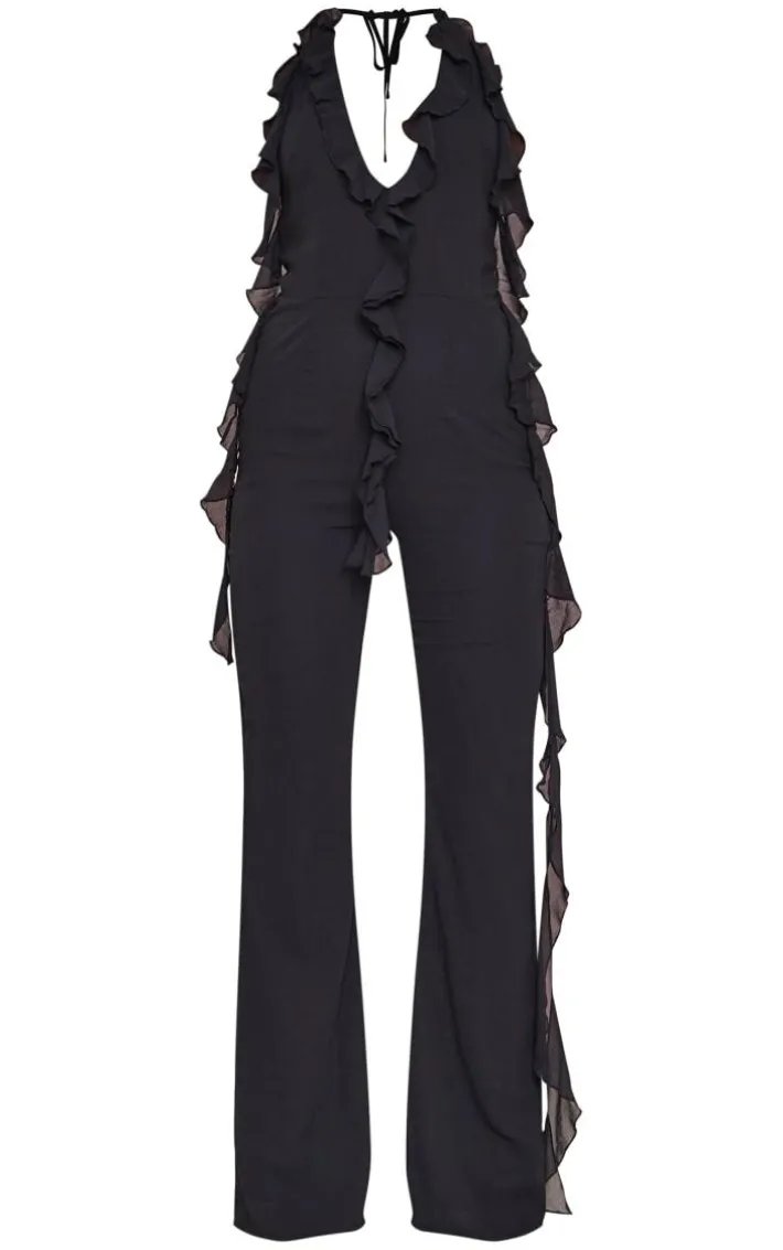 Get ready for the weekend with this black chiffon plunge extreme frill detail jumpsuit. Its black chiffon material adds some dreamy vibes whilst its plunging neckline expresses your daring side. This jumpsuit also features extreme frill details that are sure to elevate any vibe. Pair this jumpsuit with clear heels, gold accessories and a mini bag for a weekend-worthy finish that will gain all the likes on insta.