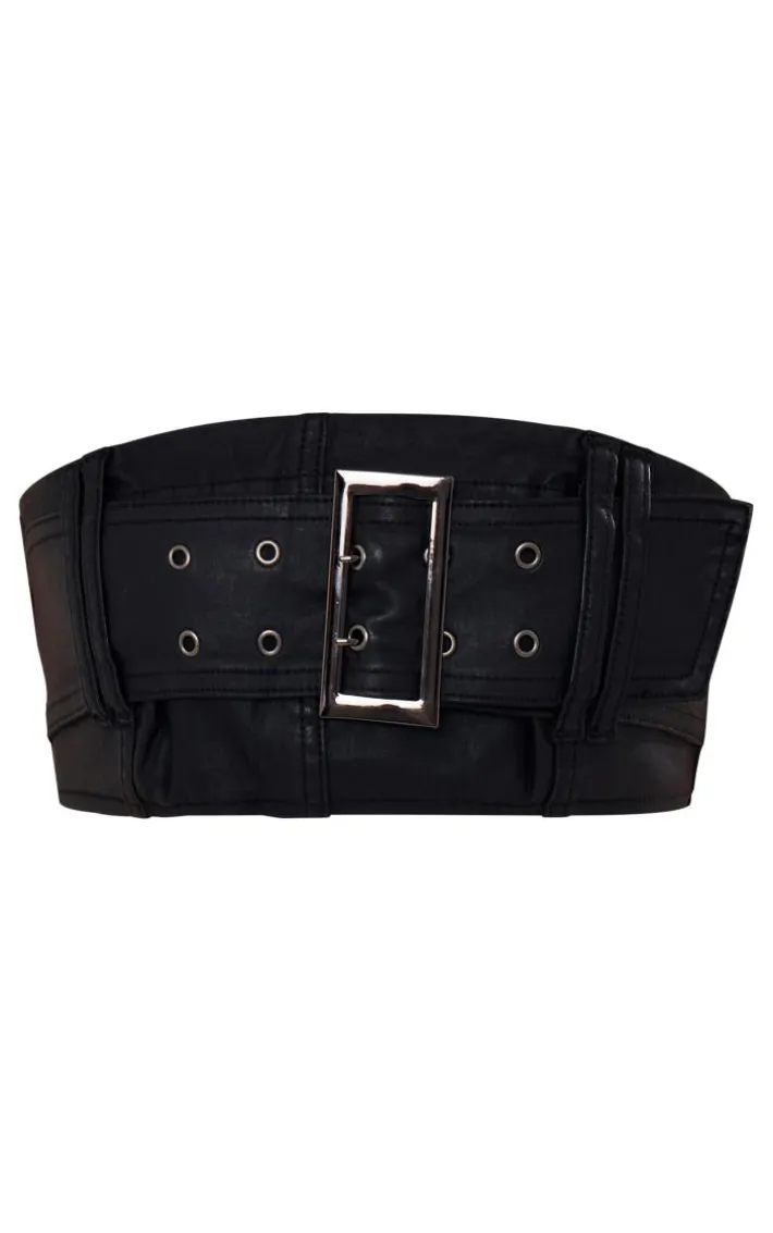 Bring some drama to your weekend look with this black coated denim buckle detail bandeau top and mini skirt set. This set includes a bandeau top and matching mini skirt, both in a black coated denim material with buckle detailing for that extra added edge, we just can’t get enough. Style this denim set with your highest heels and statement accessories for a look that is sure to have eyes on you for all the right reasons.