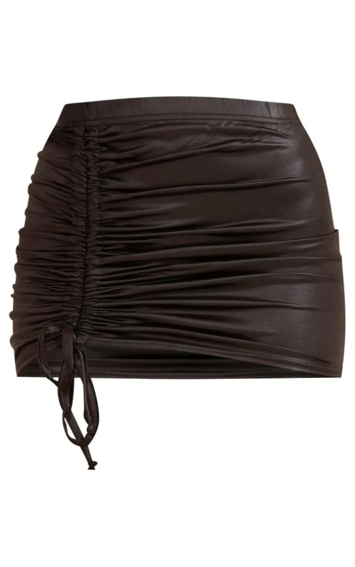 Take on your weekend the right way with this statement black coated wet look ruched micro mini skirt. Made from a black coated wet look material with ruched detailing and a micro mini length, this is everything we’re loving and more. With It’s figure-hugging fit this mini skirt is sure to hug you in all the right places. To complete the look style this seamlessly with the matching stop, knee-high boots and gold accessories for a look that will secure you all the likes.
