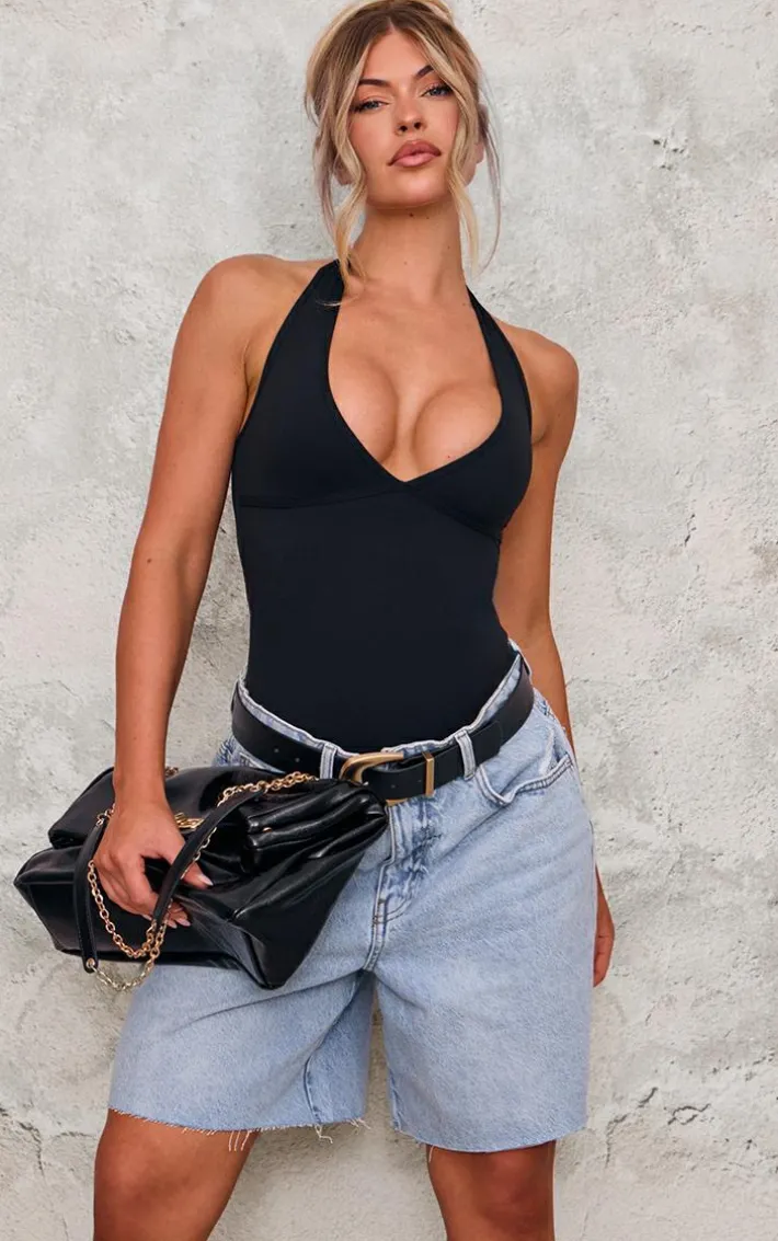This black contour halterneck bodysuit is sure to be a staple in your weekend wardrobe. Brought to you in a black contour material with a halterneck design, what more could you want? Team this black bodysuit with long shorts, heels and gold accessories for a look that is sure to earn you some serious style points.