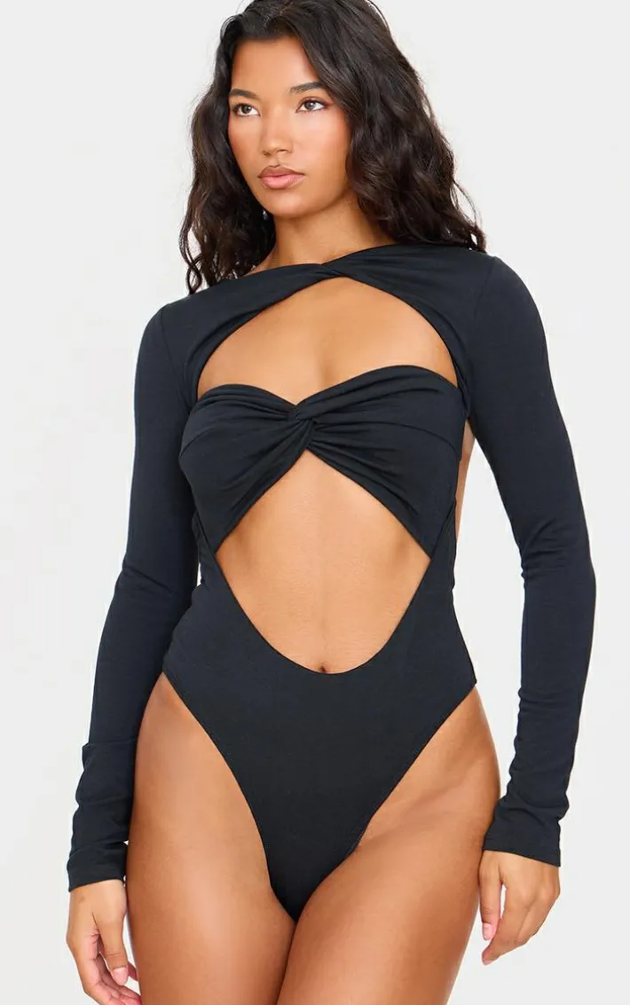 Own the night in this black contour jersey cut out bodysuit. Brought to you in a black hue contour jersey material with a cut out design, this bodysuit is everything your new season wardrobe needs and more. Pair with blue jeans, slip on heels and simple accessories for a look like no other.