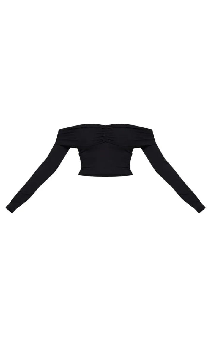 Make this black contour jersey ruched foldover bardot crop top a staple in your new season wardrobe. Brought to you in a black hue contour jersey material with a ruched design and a foldover bardot neckline, what’s not to love? Style this crop top with leopard print pants and ballet flats for a look that will earn you some serious style points this season.