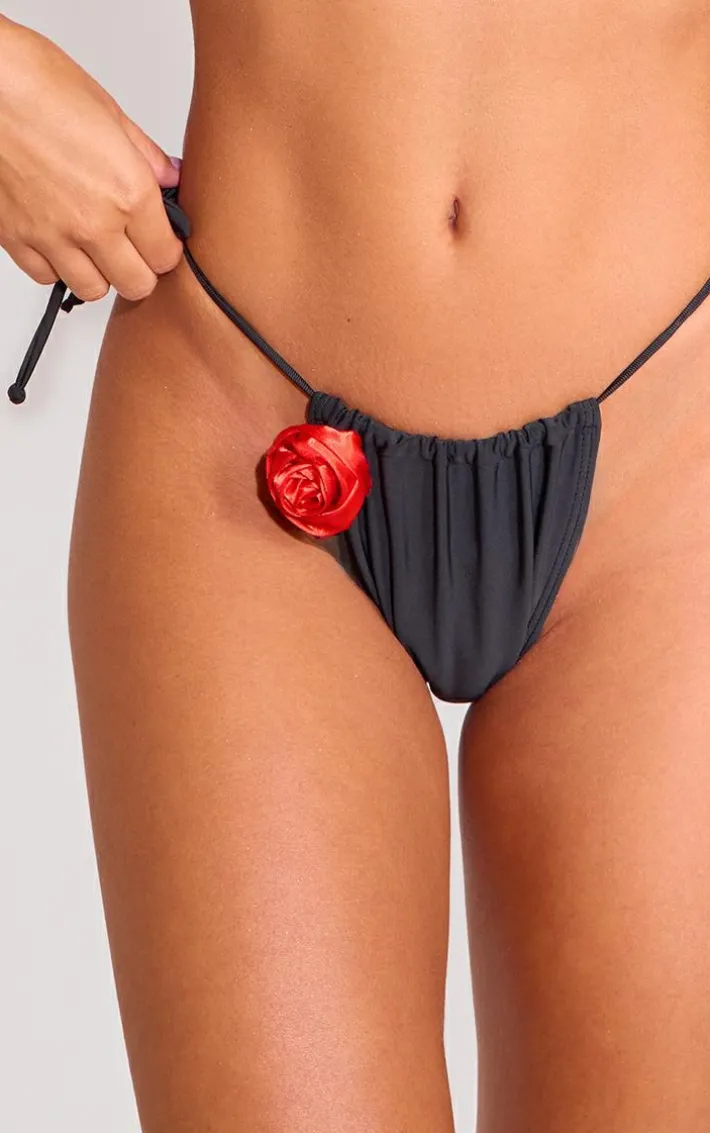 Elevate your holiday style with this black contrast flower trim tie side bikini bottoms. Brought to you in a versatile black hue, with a contrast flower trim detail and tie side design, how can you resist? Style with the matching bikini top and a pair of sandals to finish off the look.