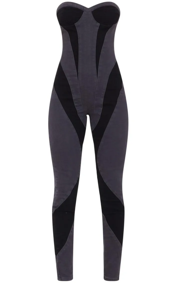 It’s time to get weekend ready with this jumpsuit. Featuring a black denim material with contrast panel detail and bardot neckline. Simple style with clear heels and hoops for a complete look.