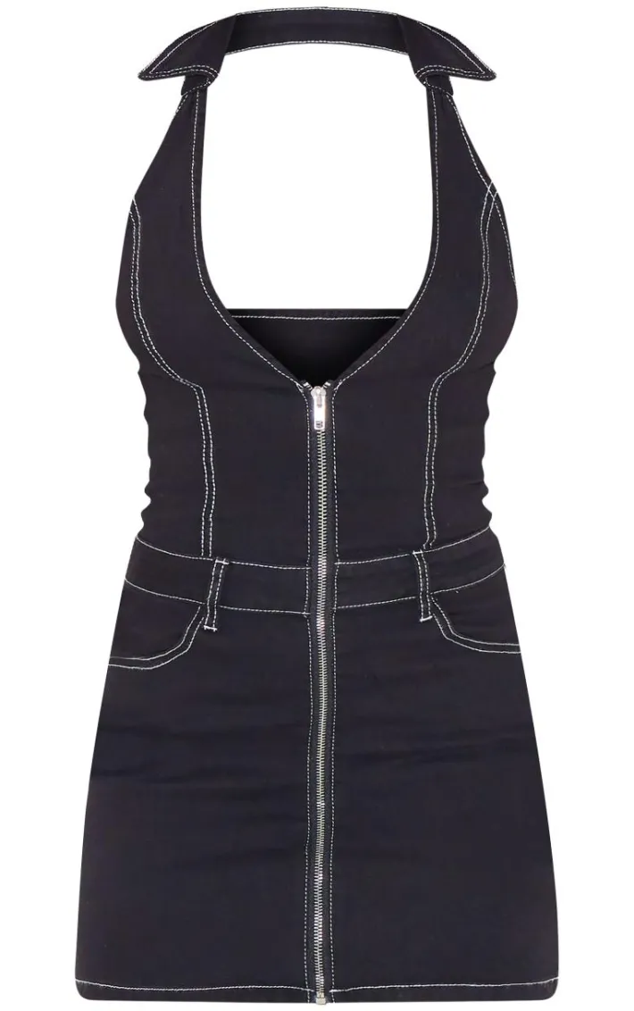 Stay on trend this season in this black contrast stitch halterneck denim mini dress. Brought to you in a black denim material with a halterneck design and contrasting stitch detailing, how can you resist? Style this mini dress with heels and a bold hue jacket for a look that is sure to make heads turn wherever you go.