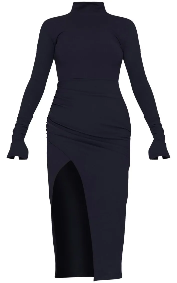 Make a statement this season with this black crepe high neck split sleeve midi dress. This dress features a black hue with a crepe detail, what’s not to love? With a high neck design, this chic dress will have you feeling confident. Why not swap your usual dress with this midi one ? Team with some clear heels and some gold hoops for a look that is sure to get you noticed.