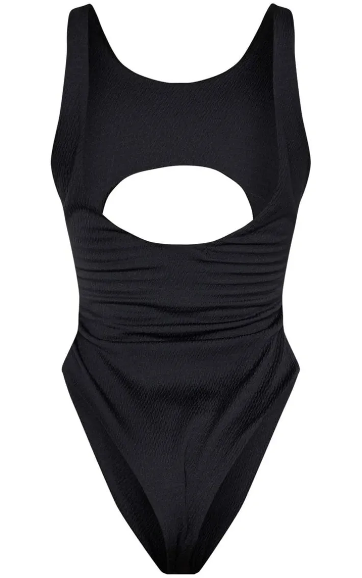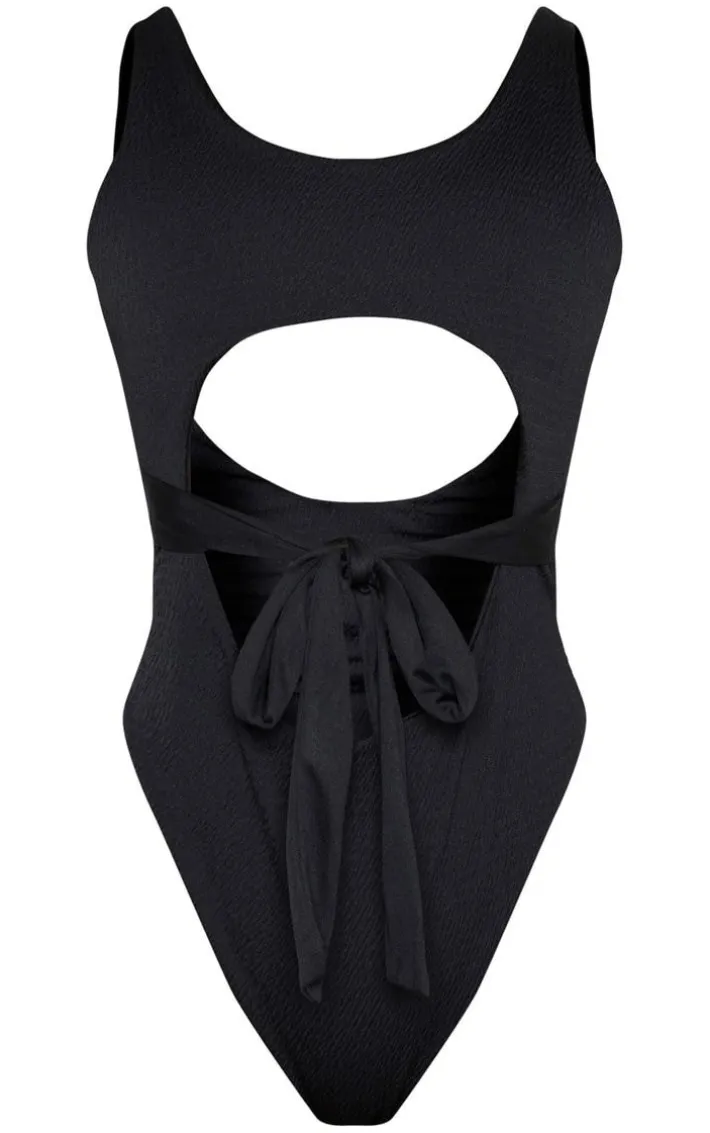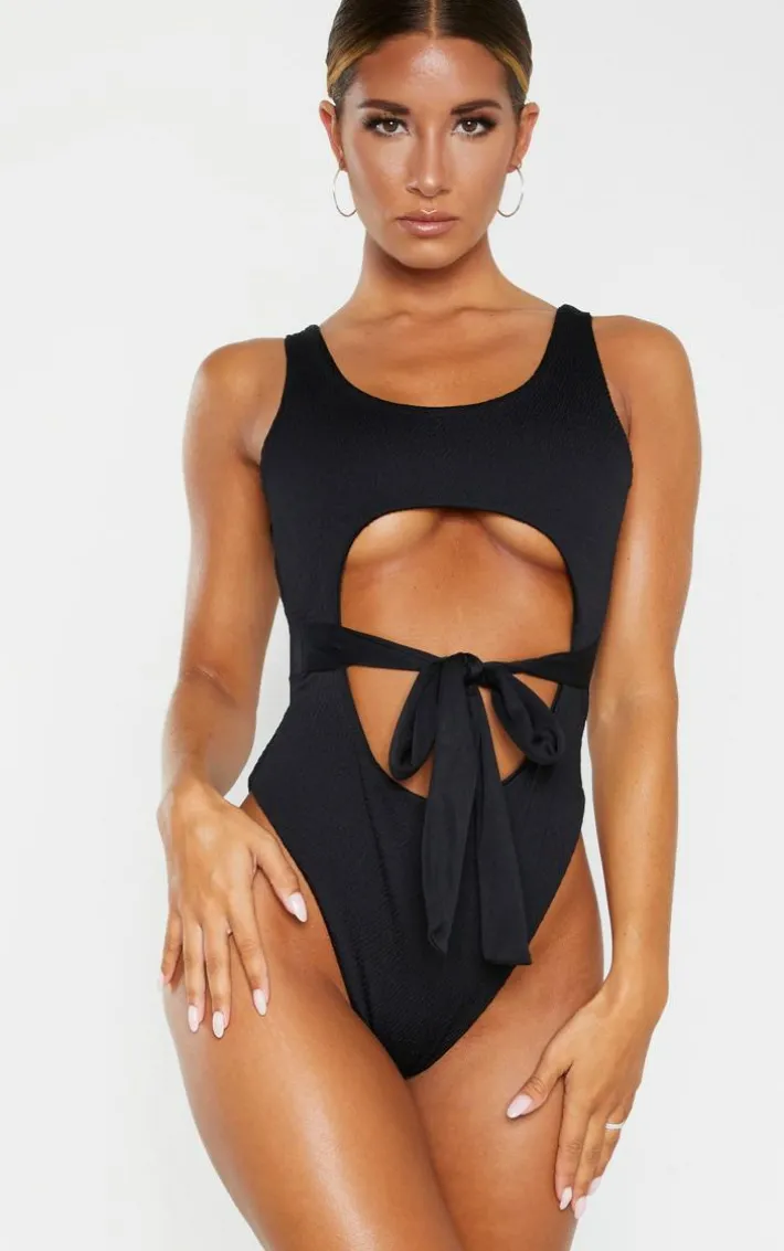 This swimsuit is the perfect addition to your vacay wardrobe. Featuring a black crinkle material, cut out detailing and a tie belt, we’re obsessed. For a poolside look we’re loving, team this with wedge sandals and simple accessories.