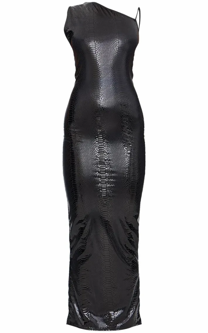 Meet your new season essential, this black croc effect one shoulder maxi dress. With its maxi dress length, black croc effect fabric and one shoulder design, you’ll be turning heads for your next evening out. Just add your favorite chic heels and a faux leather bag for a finish that isn’t to be missed.