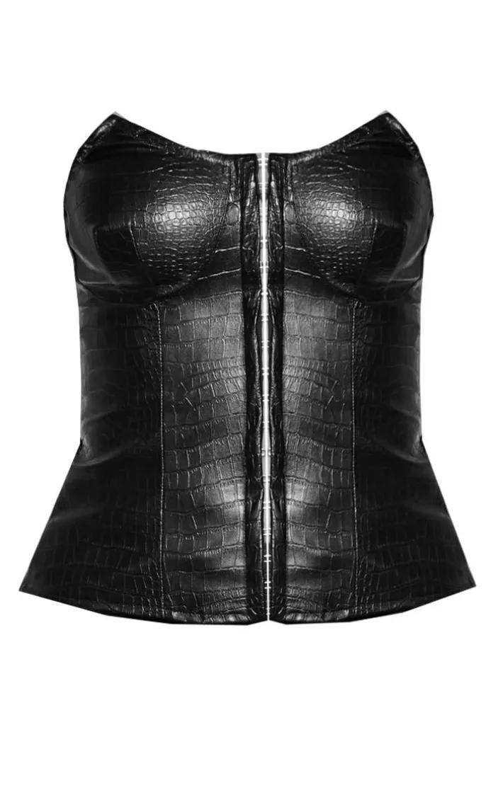 Add a touch of attitude to your weekend wardrobe with this top. Featuring a black croc PU material with a hook and eye design and a corset style. Just add PU bottoms and statement hue heels for a night with the dolls.