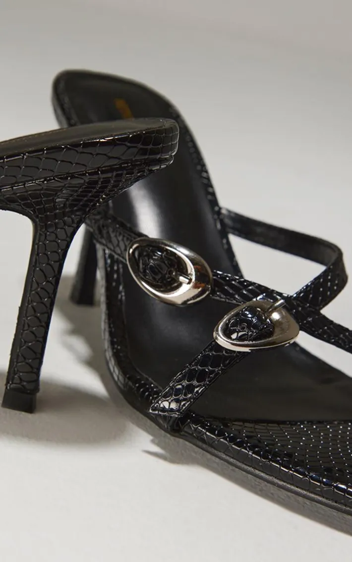 Introducing these black croc round toe silver buckle cross strap detail heeled sandals as your new season staple. Made from a black hue material with a croc pattern, round toe design, silver buckle and cross strap detail, these heeled sandals are a must have. Style with an all black fit to elevate the look. How can you resist?