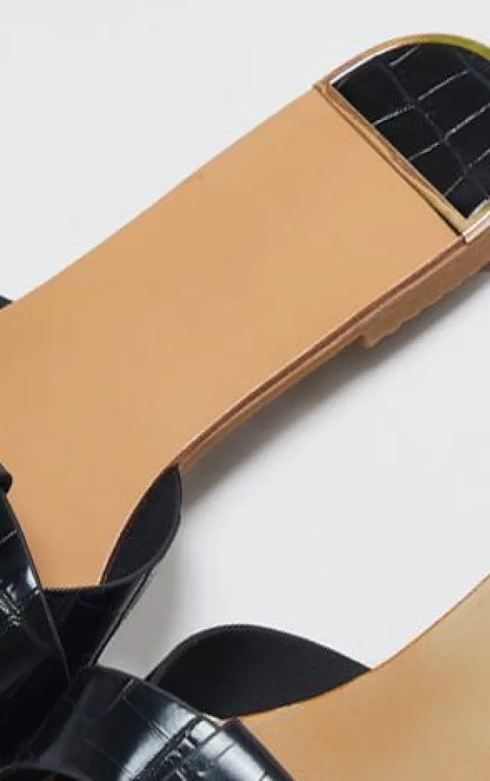 Keep your look effortlessly chic with these flat sandals. Featuring a flat tan sole and a black croc-effect faux leather strap, we are obsessed.