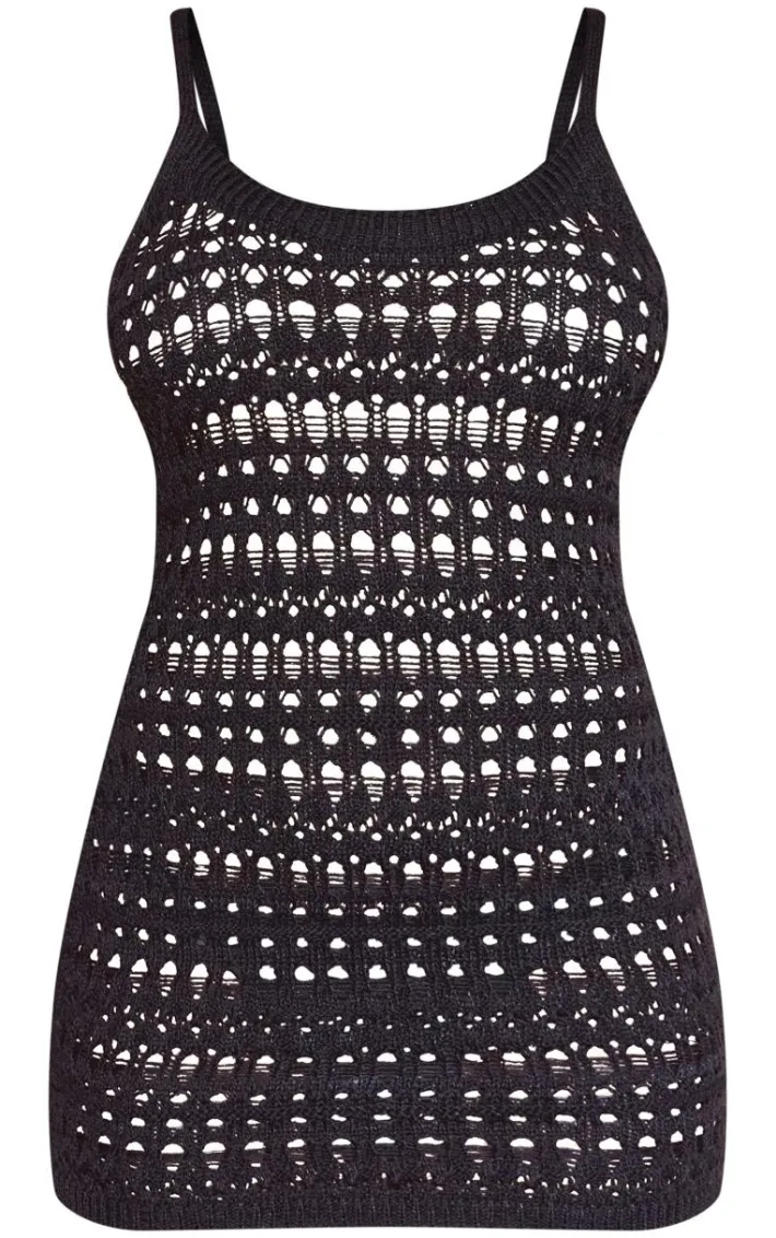 Hit refresh on your vacay wardrobe with this black crochet knit cami mini dress. Brought to you in a black crochet knit material with a cami neckline and mini length, this is all the luxe you need. Style this mini dress with black sunglasses, flatform sandals and gold accessories for a vacay vibe we’re all loving.