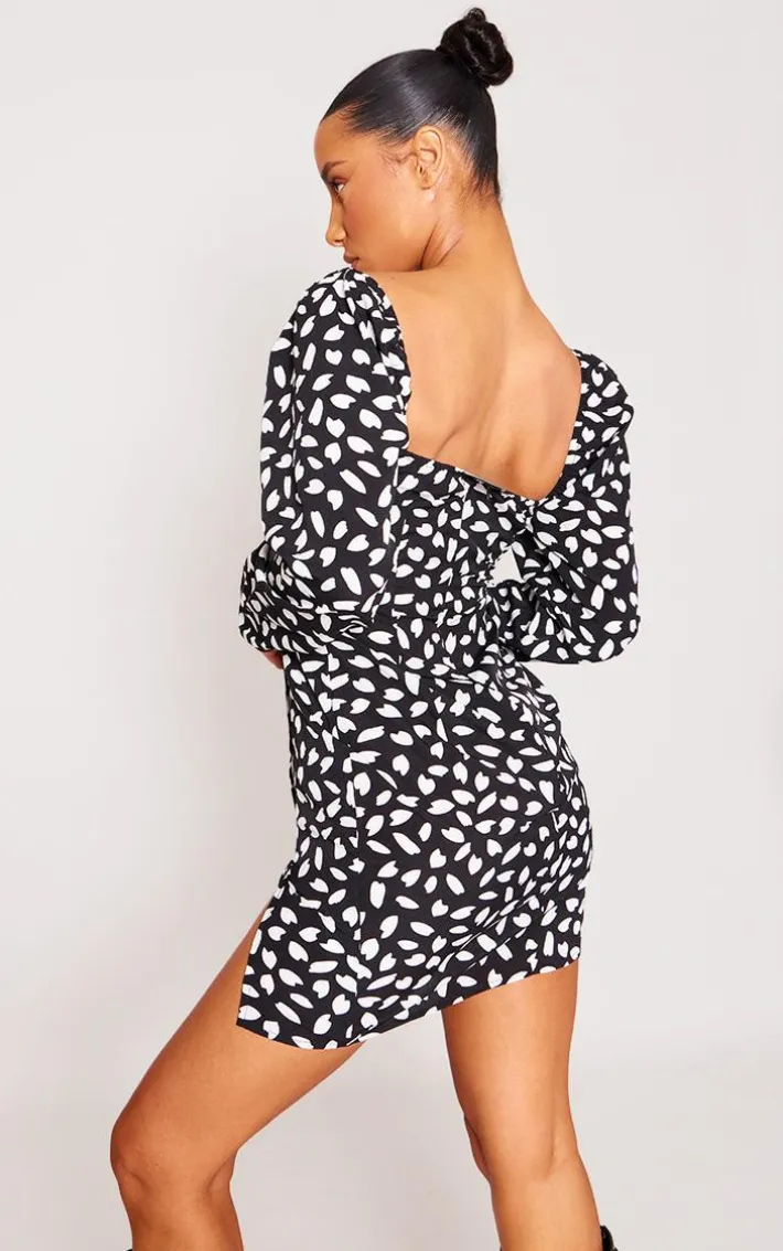 Give your off-duty look a bold update with this printed dress. Featuring a black dalmatian print material with long sleeves and bow detailing, dress it down with some chunky boots for a look we’re loving.