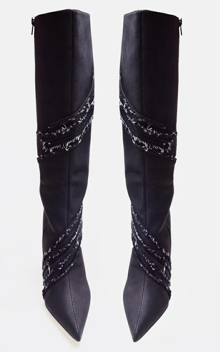 Be the topic of everyone’s conversation in these black denim diamante detail point toe high heeled knee boots. When the weekend calls these statement boots have you covered. Brought to you in a black denim material with diamante detailing, a pointed toe and a high heel, how could you resist? Wear with your weekend look for a show-stopping finish.