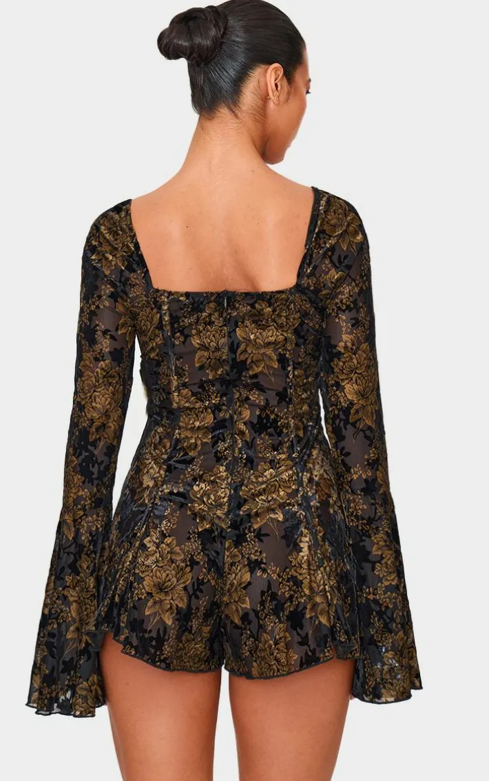 Switch out your staple little black dress for this black devore long sleeve romper. Brought to you in a black devore material with long sleeves and a flattering fit, how can you go wrong? Style this black romper with heels and simple accessories for an effortlessly chic look we’re loving.