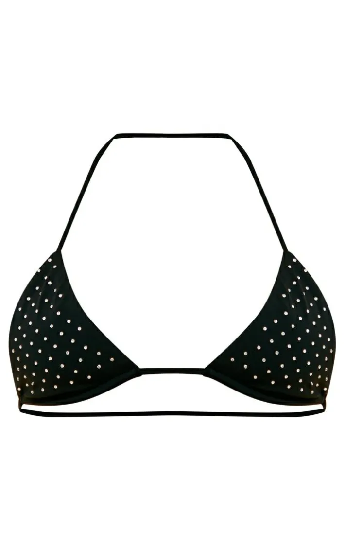 Look all kinds of glam in this black diamante detail micro triangle bikini top. This bikini top is made from a black diamante material for an eye catching look you won’t be able to resist. With a triangle design, this bikini top is perfect for those pool days. Team with the matching bottoms and some gold hoops to elevate the look.