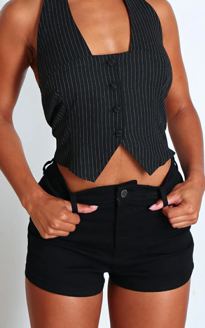 Disco styles are the ultimate for showing off your best assets and we are loving this style. Featuring a black denim fabric with a tight fit and belt holes, style these shorts with a graphic tee and statement belt.