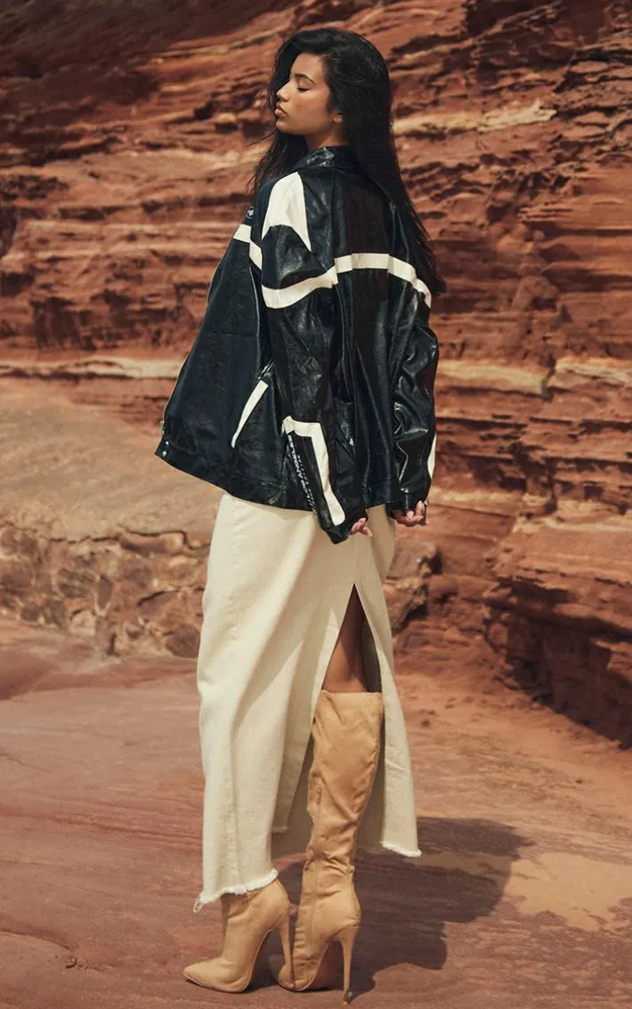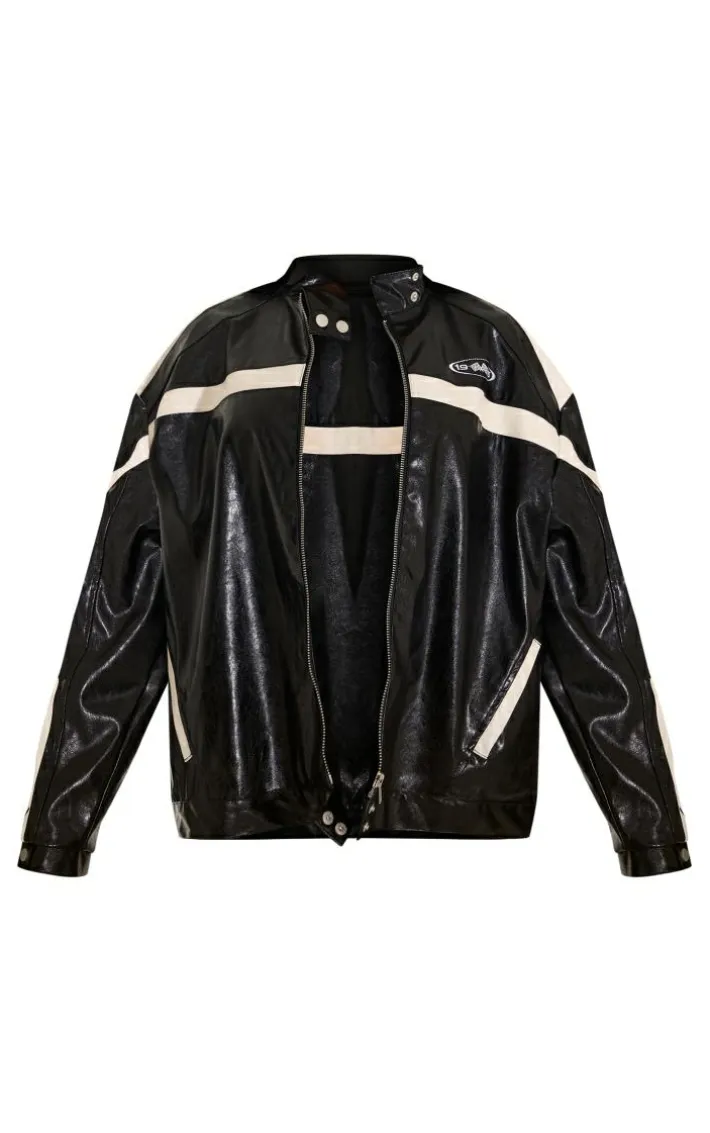 Get that effortlessly cool vibe this season with this black distressed faux leather racer jacket. This racer jacket is a must-have for this season and will earn you some serious style points with its black distressed faux leather material. Its contrast white details give it an added edge and the oversized fit is totally fresh. Keep up with the cool vibe by adding a basic black bodycon dress, shades and heeled boots.
