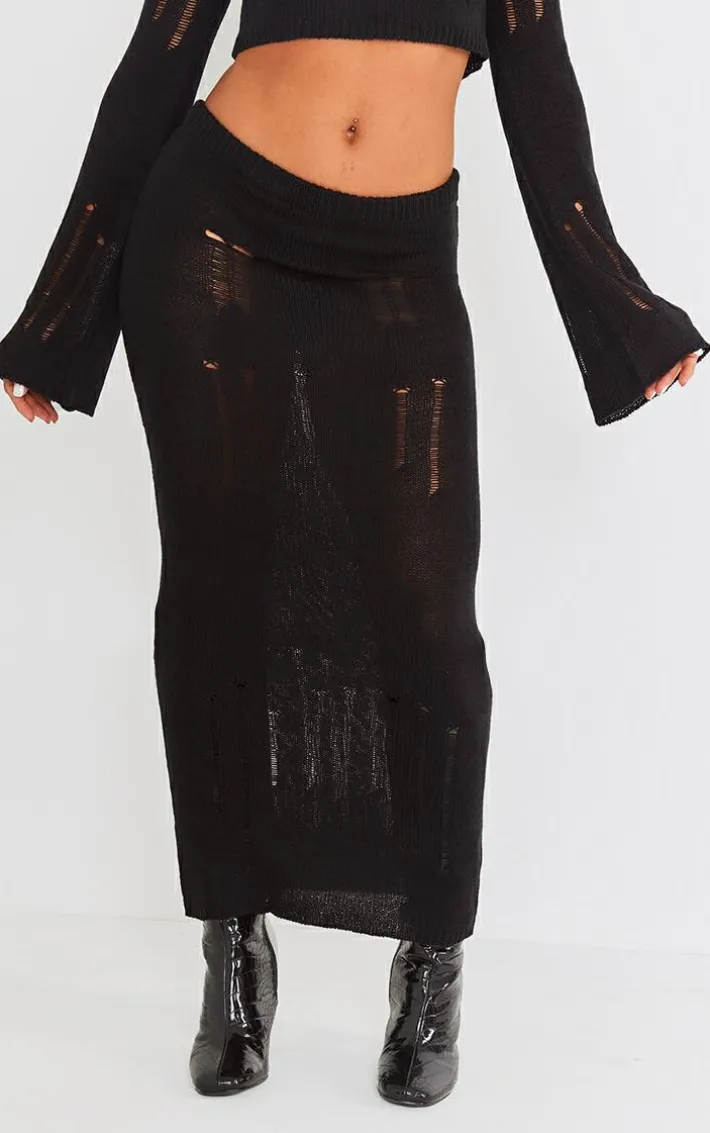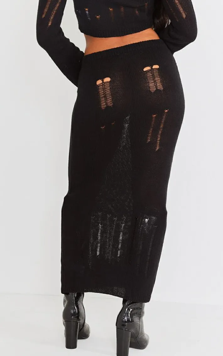 Add a little attitude to your outfit of the day with this black distressed ladder knit maxi skirt, you won’t be able to resist this statement piece. It is made using a black ladder knit material with a distressed design and a maxi length, we’re in love. Team this maxi skirt with the matching top, heeled boots and a shoulder bag for a fool proof finish.